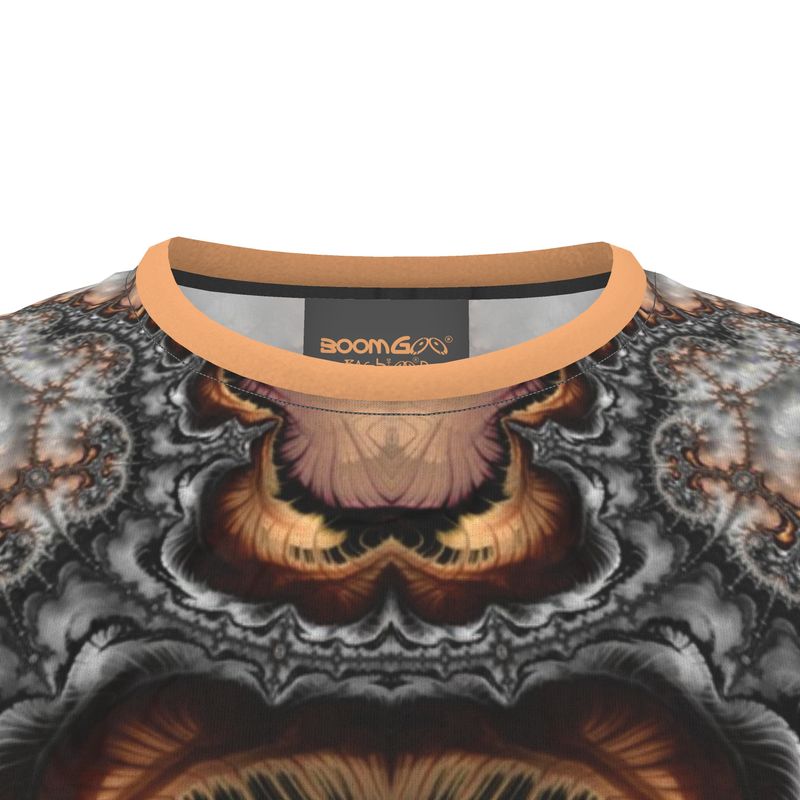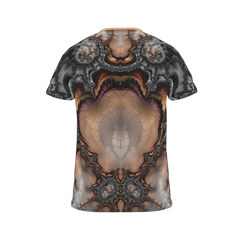 Abstract art all-over print : ) T-shirt F1632 ""Celestial da Vinci - Antique" I 3 • main colors: peach copper grey • unisex T-shirt: • 2 fabrics: recycled poly (4% elastane / moisture wicking) or Bounce cotton Jersey (elastane / midweight / soft / stretchy) • 12 sizes: 2XS - 2XL • washing machine: 30°C 85°F / low tumble dry / no wring / low iron or steam