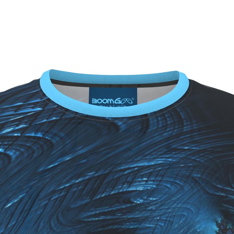 Abstract art all-over print : ) T-shirt F404 "Aqua Dragon" • main colors: blue, black • unisex T-shirt: • 2 fabrics: recycled poly (4% elastane / moisture wicking) or Bounce cotton Jersey (elastane / midweight / soft / stretchy) • 12 sizes: 2XS - 2XL • washing machine: 30°C 85°F / low tumble dry / no wring / low iron or steam