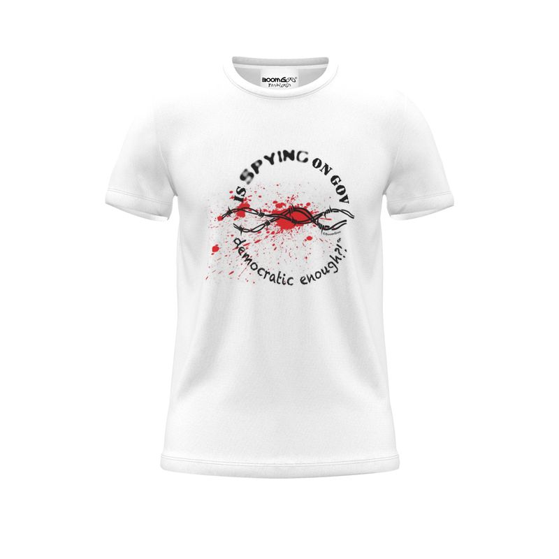 Freedom ; ) T-shirt - "Is Spying on GOV democratic enough?!" • the world's first Freedom logo! Combines multiple justice symbols: Peace | Yin Yang | Anonymous Moustache | Pirate; finally a World Peace-Freedom flag for Universalism / Planetarianism, healing creativity, as none of us choose where we’re born! We are all 1 human race, racism makes no sense, we're interconnected, interdependent, we only have 1 planet, 1 chance – join the Freedom movement ; ) • main colors: black, red • unisex T-shirt: 2 fabrics: recycled poly (4% elastane / moisture wick) or Bounce cotton Jersey (elastane / midw. / soft / stretchy) • 12 sizes: 2XS - 2XL • wash 30°C 85°F