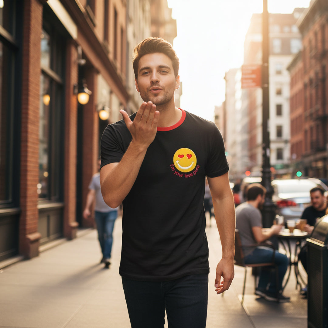 Happy T-shirt I 16 "i'm your love guru" (S41100) black - print on both sides ; ) • art theme: 3D funny sunny joyful heart-shaped-eyed love wink ; ) • main colors: yellow red • unisex T-shirt: • 2 fabrics: recycled poly (4% elastane / moisture wicking) or Bounce cotton Jersey (elastane / midweight / soft / stretchy) • 12 sizes: 2XS - 2XL • washing machine: 30°C 85°F / low tumble dry / no wring / low iron or steam