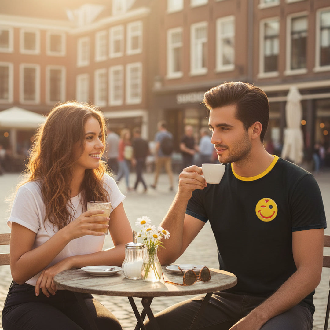 Happy T-shirt I 4 (S30080 - print on both sides ; ) • art theme: 3D funny sunny joyful wise love guru wink ; ) • main colors: yellow red gray • unisex T-shirt: • 2 fabrics: recycled poly (4% elastane / moisture wicking) or Bounce cotton Jersey (elastane / midweight / soft / stretchy) • 12 sizes: 2XS - 2XL • washing machine: 30°C 85°F / low tumble dry / no wring / low iron or steam
