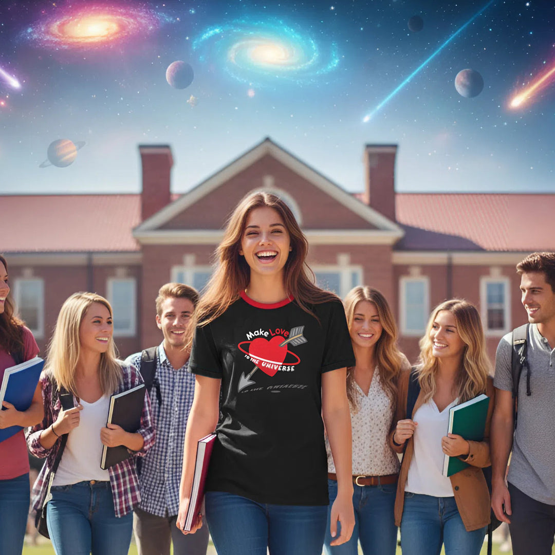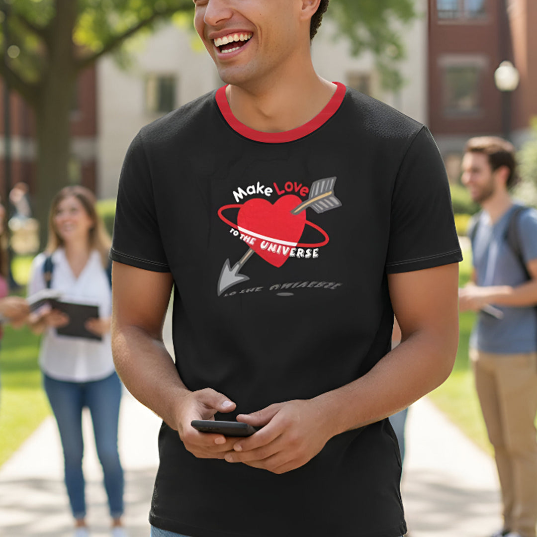 Love ; ) T-shirt - "Make Love to the Universe" for universal natural harmony / peace / planetarian healing / creativity in the world • main colors: black, red, grey • unisex T-shirt: • 2 fabrics: recycled poly (4% elastane / moisture wicking) or Bounce cotton Jersey (elastane / midweight / soft / stretchy) • 12 sizes: 2XS - 2XL • washing machine: 30°C 85°F / low tumble dry / no wring / low iron or steam
