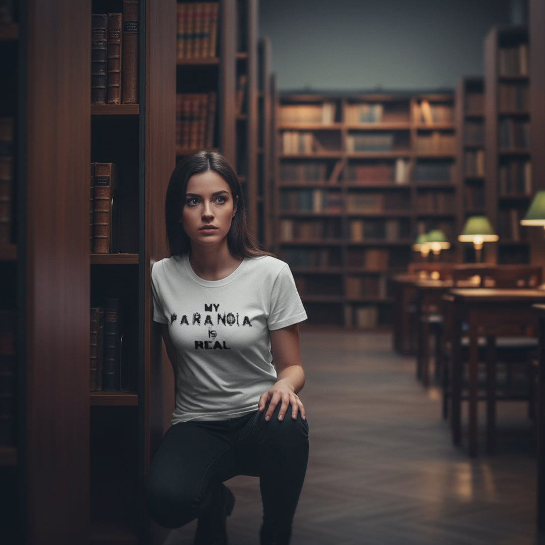 Humor : ) T-shirt "My Paranoia is Real" ; ) I 1 • main colors: black • unisex T-shirt: • 2 fabrics: recycled poly (4% elastane / moisture wicking) or Bounce cotton Jersey (elastane / midweight / soft / stretchy) • 12 sizes: 2XS - 2XL • washing machine: 30°C 85°F / low tumble dry / no wring / low iron or steam
