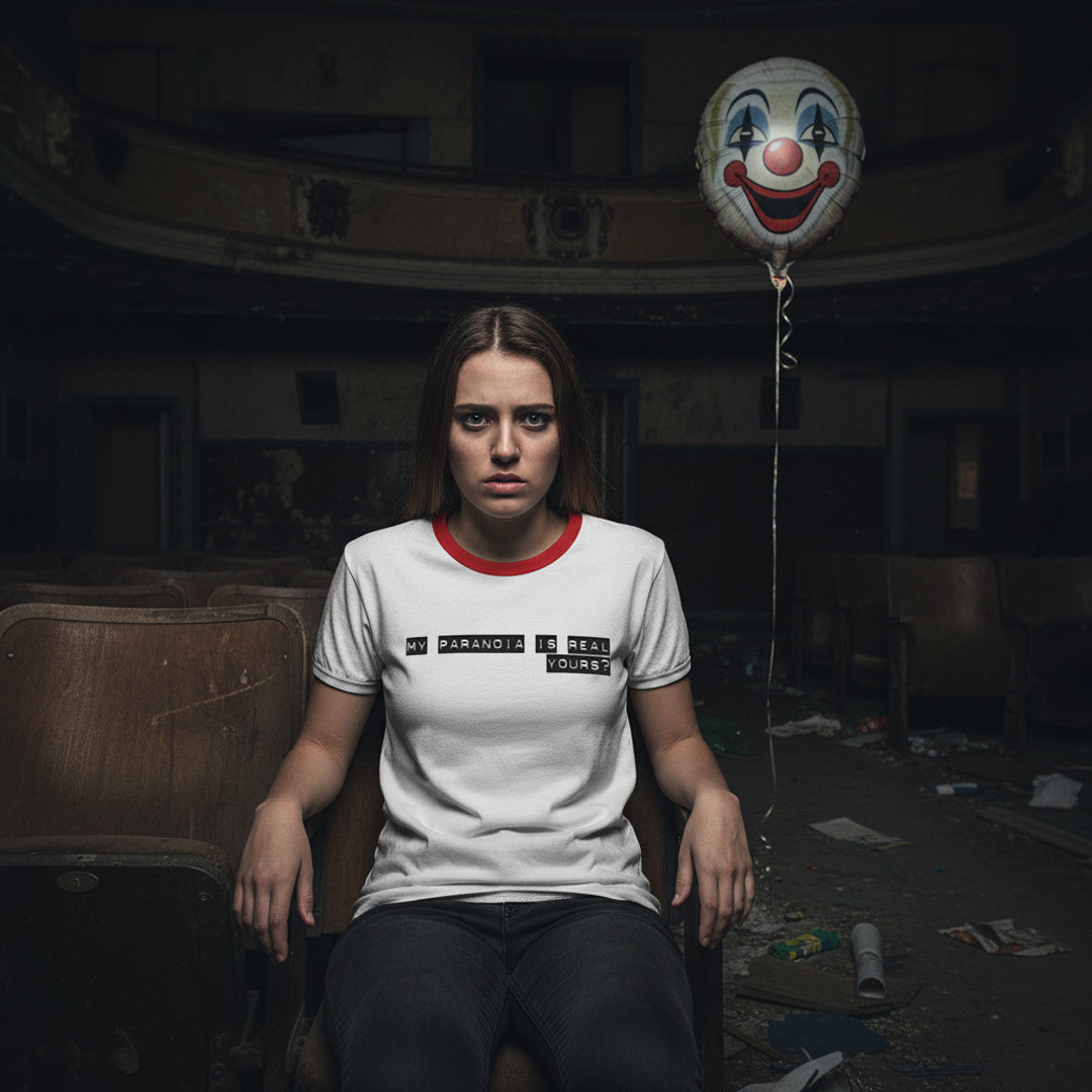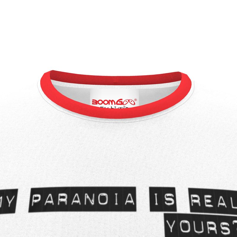 Humor : ) T-shirt "My Paranoia is Real" ; ) II 1 • main colors: black, red • unisex T-shirt: • 2 fabrics: recycled poly (4% elastane / moisture wicking) or Bounce cotton Jersey (elastane / midweight / soft / stretchy) • 12 sizes: 2XS - 2XL • washing machine: 30°C 85°F / low tumble dry / no wring / low iron or steam