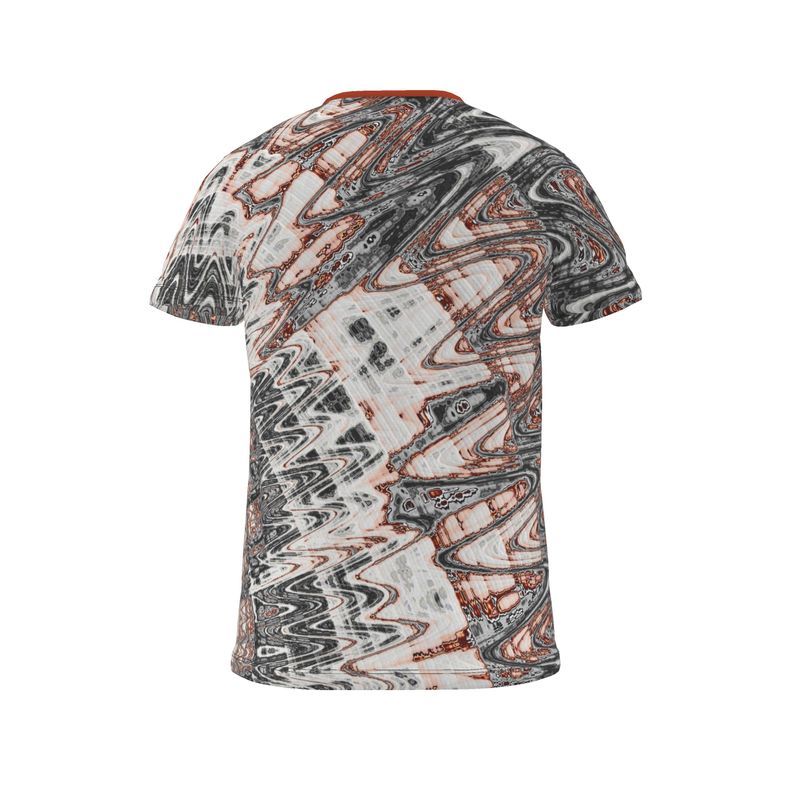 Abstract art all-over print : ) T-shirt F1180 "Pink Salmon Marble" I • main colors: salmon pink gray black white • unisex T-shirt: • 2 fabrics: recycled poly (4% elastane / moisture wicking) or Bounce cotton Jersey (elastane / midweight / soft / stretchy) • 12 sizes: 2XS - 2XL • washing machine: 30°C 85°F / low tumble dry / no wring / low iron or steam